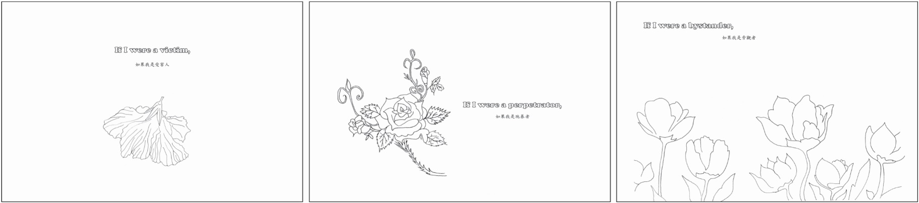 The public’s approach to the task was outside my original expectations and was not limited by the task’s original design. Most people are willing to take on the role of the victim, which made the images produced vivid. Participants not only used the original design, which is a flower fallen onto the ground, but, for example a viewer painted petals like peeled flesh, triggering pain when looking at it. Some people expressed their feelings directly. If s/he was a victim, s/he felt tarnished, humiliated, angry, and desperate. Some wanted revenge, and some pretended that nothing had happened. Some hid their feelings and suffered from depression; some had nightmares and felt fearful. Some felt it difficult to trust others.