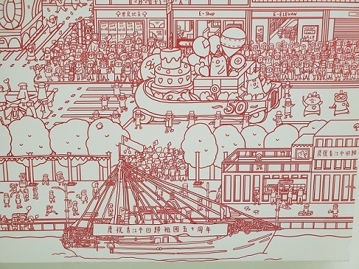 學生總會憧憬未來,加一點想像,加幾份幽默,創作出純真的作品。甘思雅對2047的想像在《20470701》中紅白分明地展現,然而有別其他同樣在預測未來的繪本作品,她把書內一幅重點圖作放大並置,畫面是香江市市民擠滿街頭慶祝,很耐看,筆者不禁嘴角上揚舒展眉頭,猶如在細閱20190616黑壓壓的軒尼詩道的新聞頭條。如果剛才麥永揚的刀刃是對物件本質的思考,周芷瑤對工具的《本相》也有幽默的演繹,一系列小工具在展示身體包括指頭、拳頭、手掌如何協助完成工序,工具乃身體的延伸,不禁又想起「手臂伸延」和「胸部襲警」。