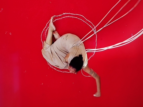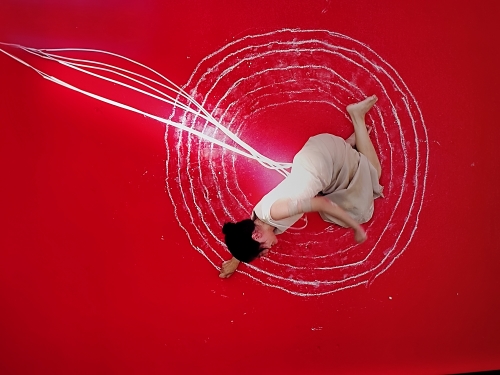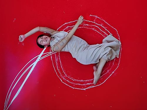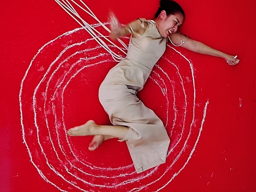 一踏進展場,不其然會被泰國藝術家 Kawita Vatanajyankur 的簡潔有力作品吸引。她的行為藝術《人體外殼裡的機器幽靈》乍看很簡單:在艷紅色地板上用白粉筆畫出一圈圈向外旋轉的圓,但同時結合 Pat Pataranutaporn 開發的 AI 程式,透過電極控制痛覺強度,直接干涉藝術家的身體感受與動作。畫面的圓圈逐漸擴大,身體的抽搐也越來越明顯,作品呈現了科技對身體的掌控張力,以及人類意志與機械指令之間的拉鋸戰。