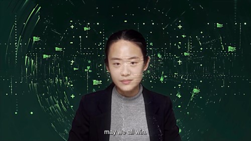 傅秀璇(Charmaine Poh)來自新加坡,現為「柏林漂」。在《早安,青春肉體》中,她玩deep-fake技術,將自己12歲的童年電視影像擷取出來,化身網路新聞主播,揭露網路文化同樣是集體焦慮與性別不公的溫床,騷擾、暴力消費女性身體在線上線下皆然。影片中,傅引用Legacy Russell的「故障女權主義」來自我賦權;Russell在《Glitch Feminism: A Manifesto》中主張,將數位空間的「故障」視為拒絕與抗爭的力量,是解構性別二元、重塑身體與身份敘事的策略,並邀請我們在數碼縫隙中開拓多元、流動的自我表現方式。