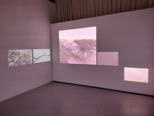 陳若璠以多頻道影像裝置《暖樹》安放她對逝去愛犬的情深寄託,展現人類透過科技尋求慰藉的想望。作品以纏繞的紫藤枝象徵思念的延綿,栗殼纖維還原犬毛的觸感,透過3D建模塑造出毛絨質感的樹體,再以呼吸節奏的動畫注入生命,使愛犬在數碼影像的持續流動中存在;再配合多重